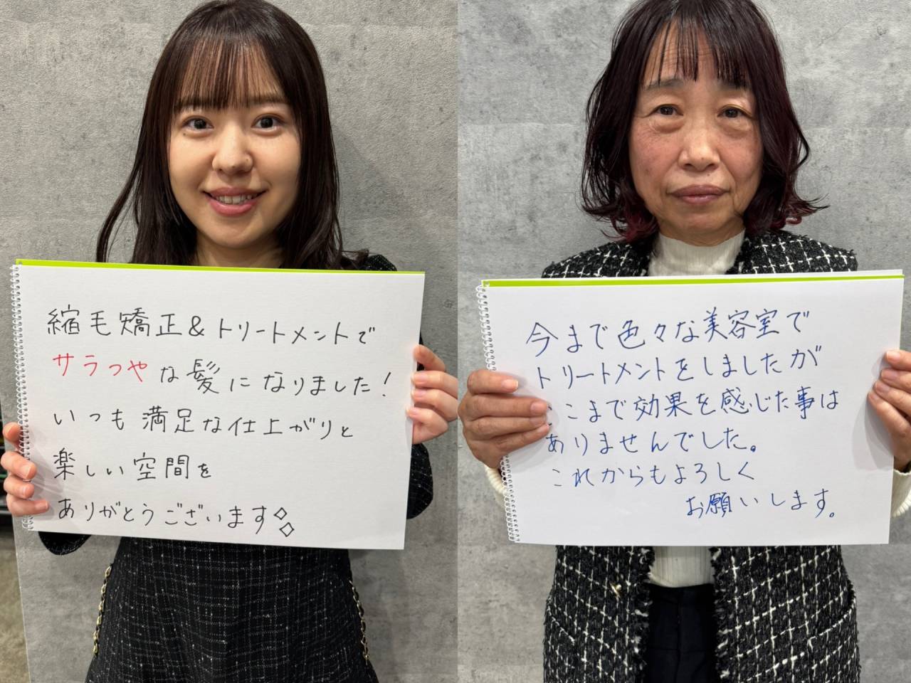 たった一回の施術で髪質の改善が完了して、今までどうしようもなかった髪のお悩みはなくなり、さまざまなヘアスタイルを楽しんでいただいております。