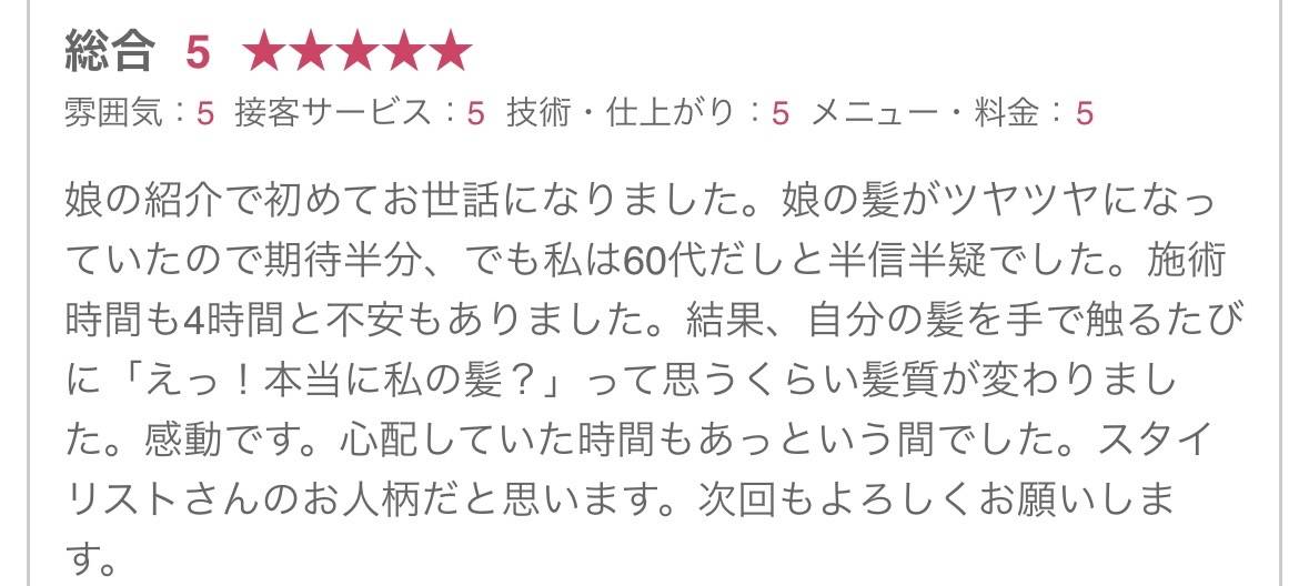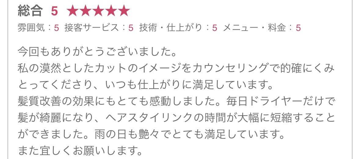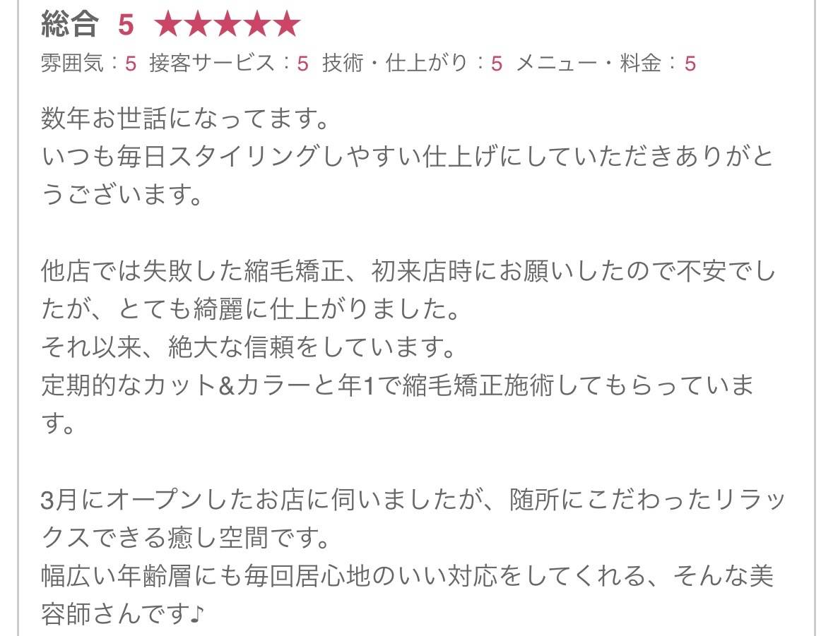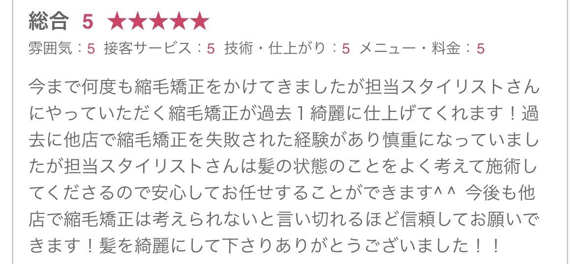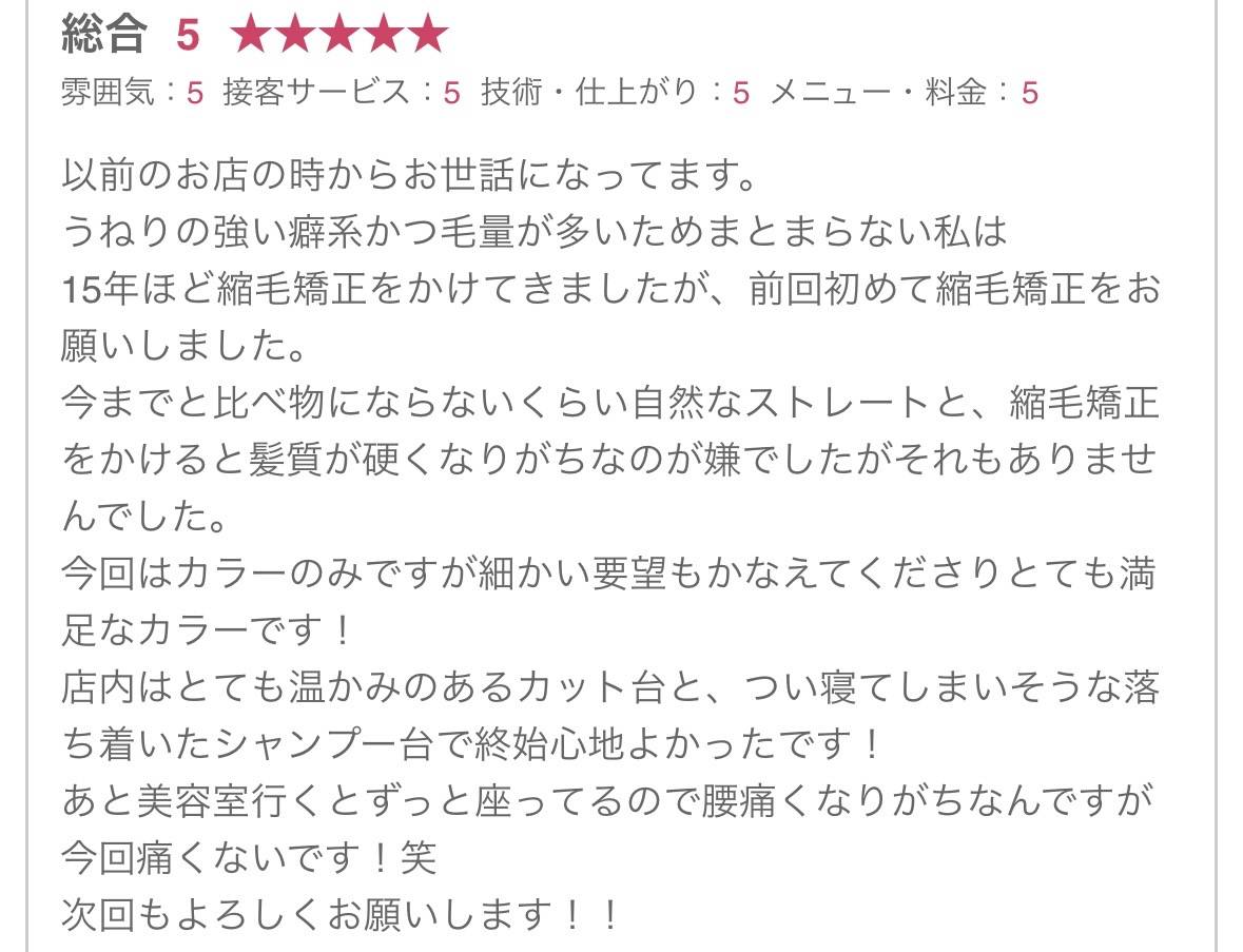 ホームページをみてご来店していただき、乾かすだけでキレイにまとまるようになり「私の髪でもこんなにキレイになるんだ」とお喜びの感想を頂きました。