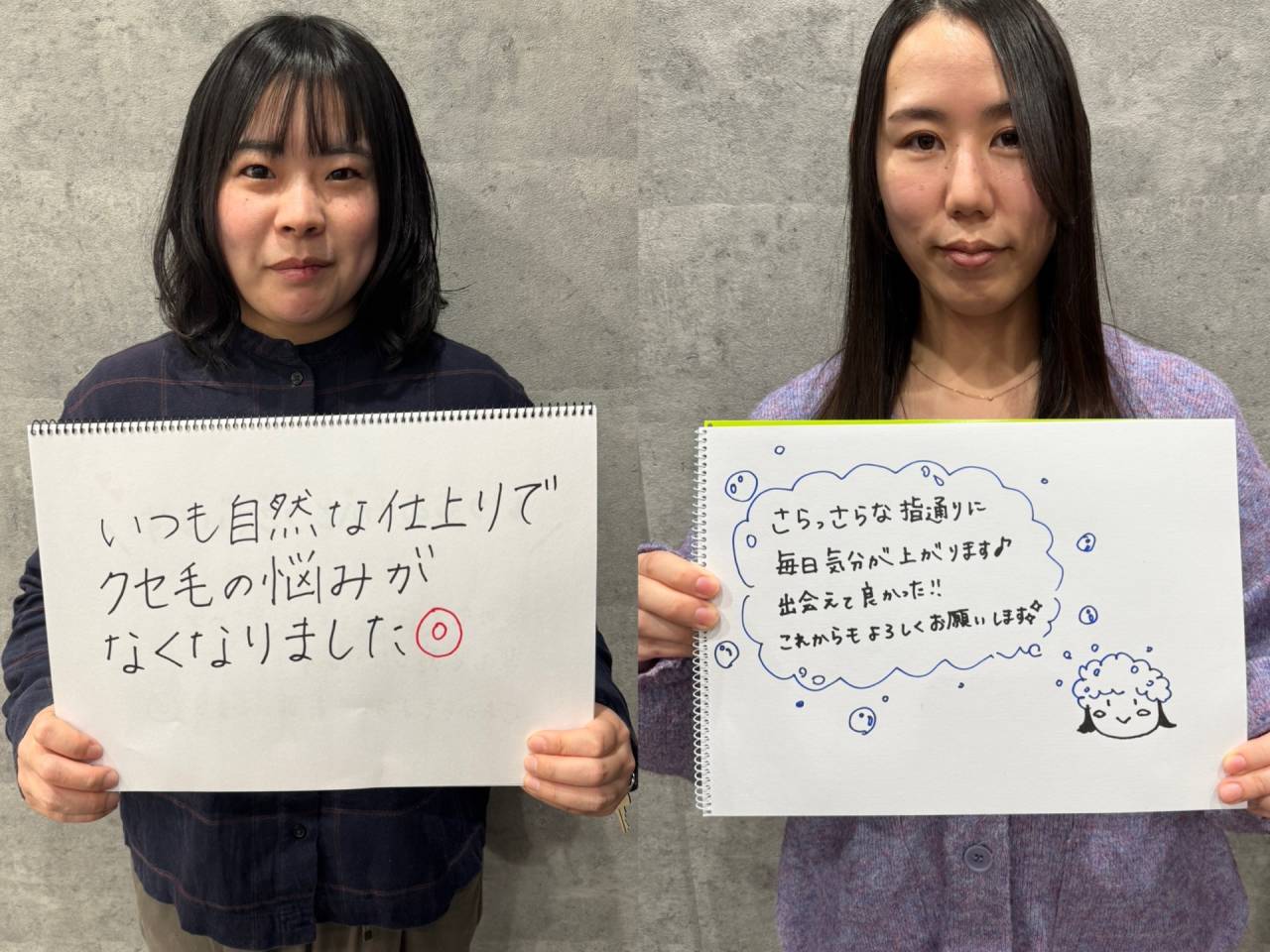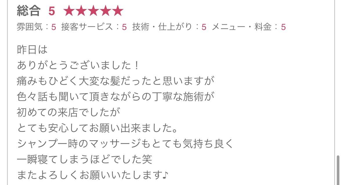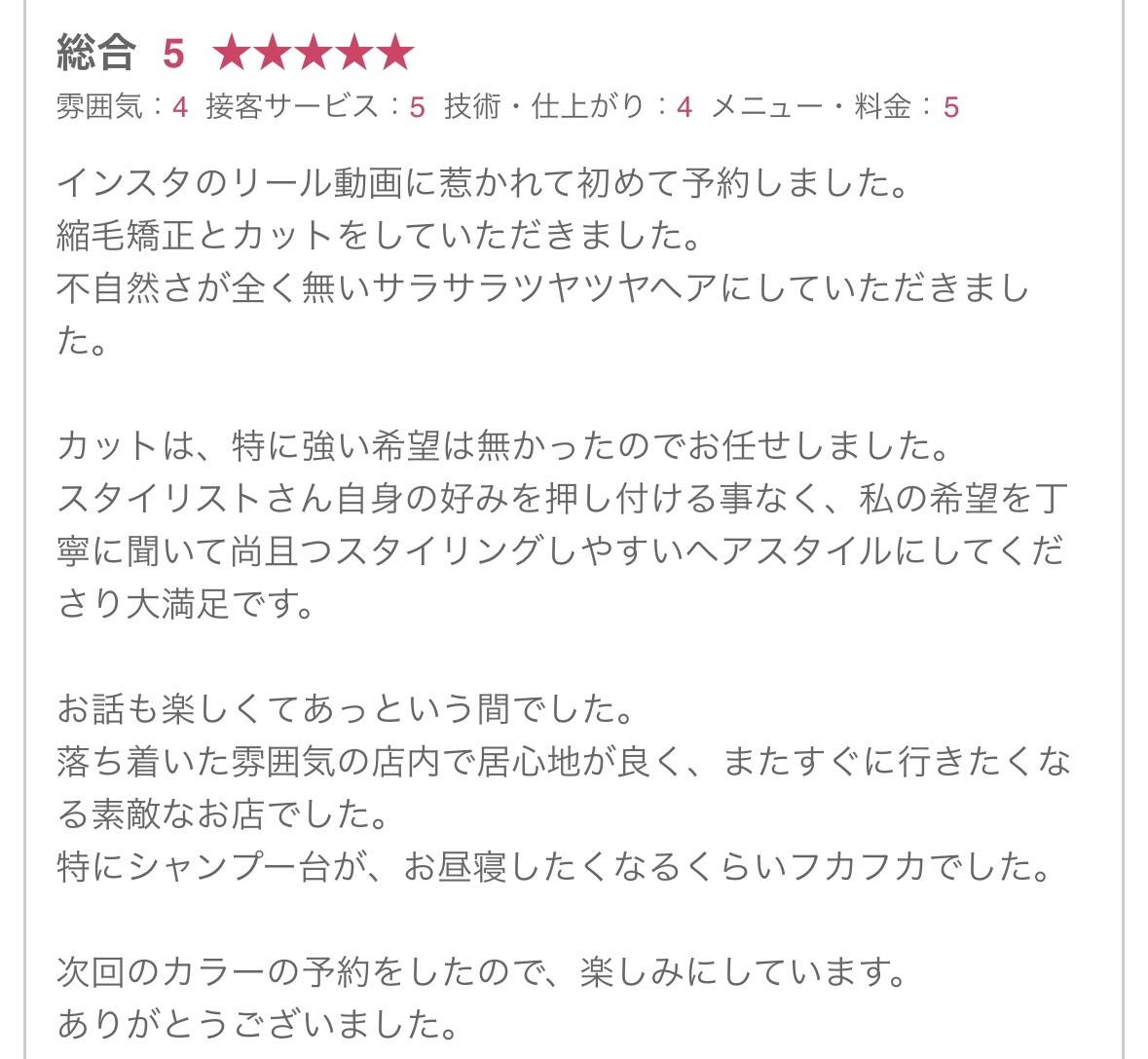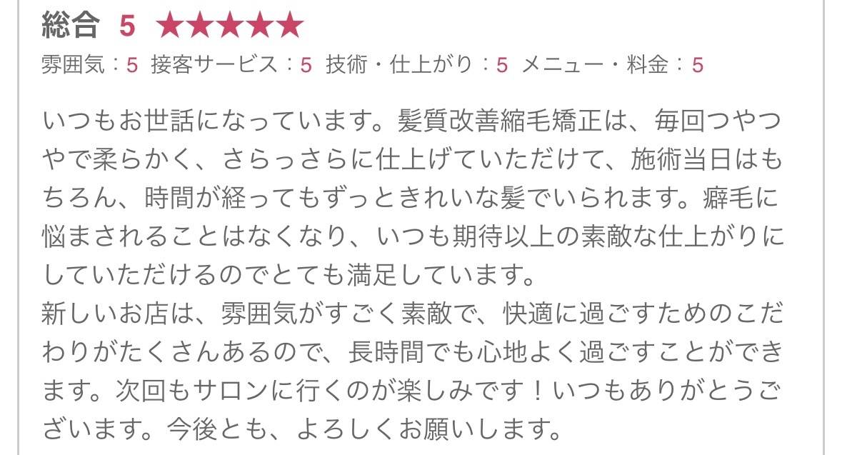 ホームページをみてご来店していただき、乾かすだけでキレイにまとまるようになり「私の髪でもこんなにキレイになるんだ」とお喜びの感想を頂きました。