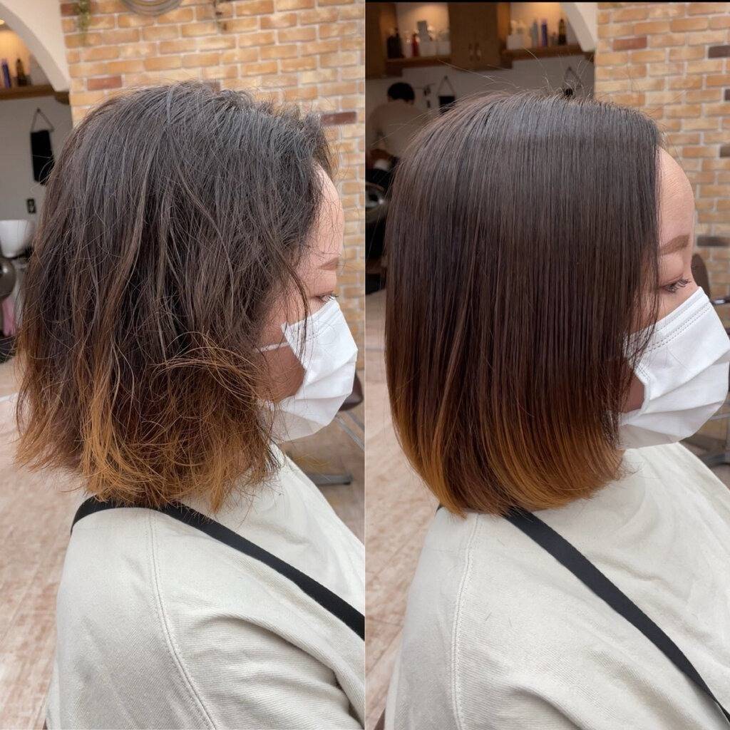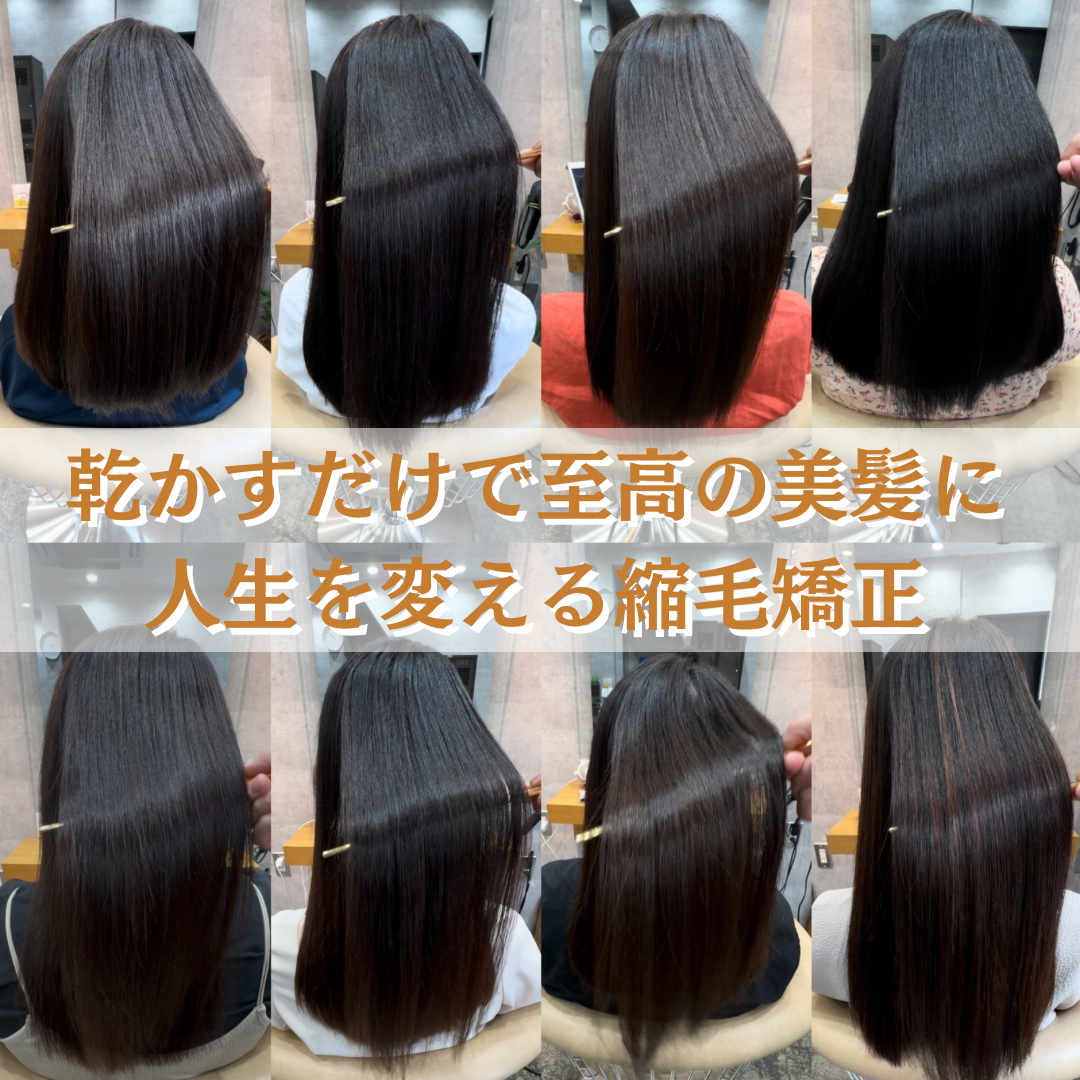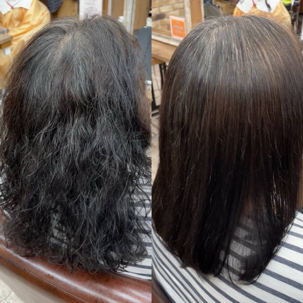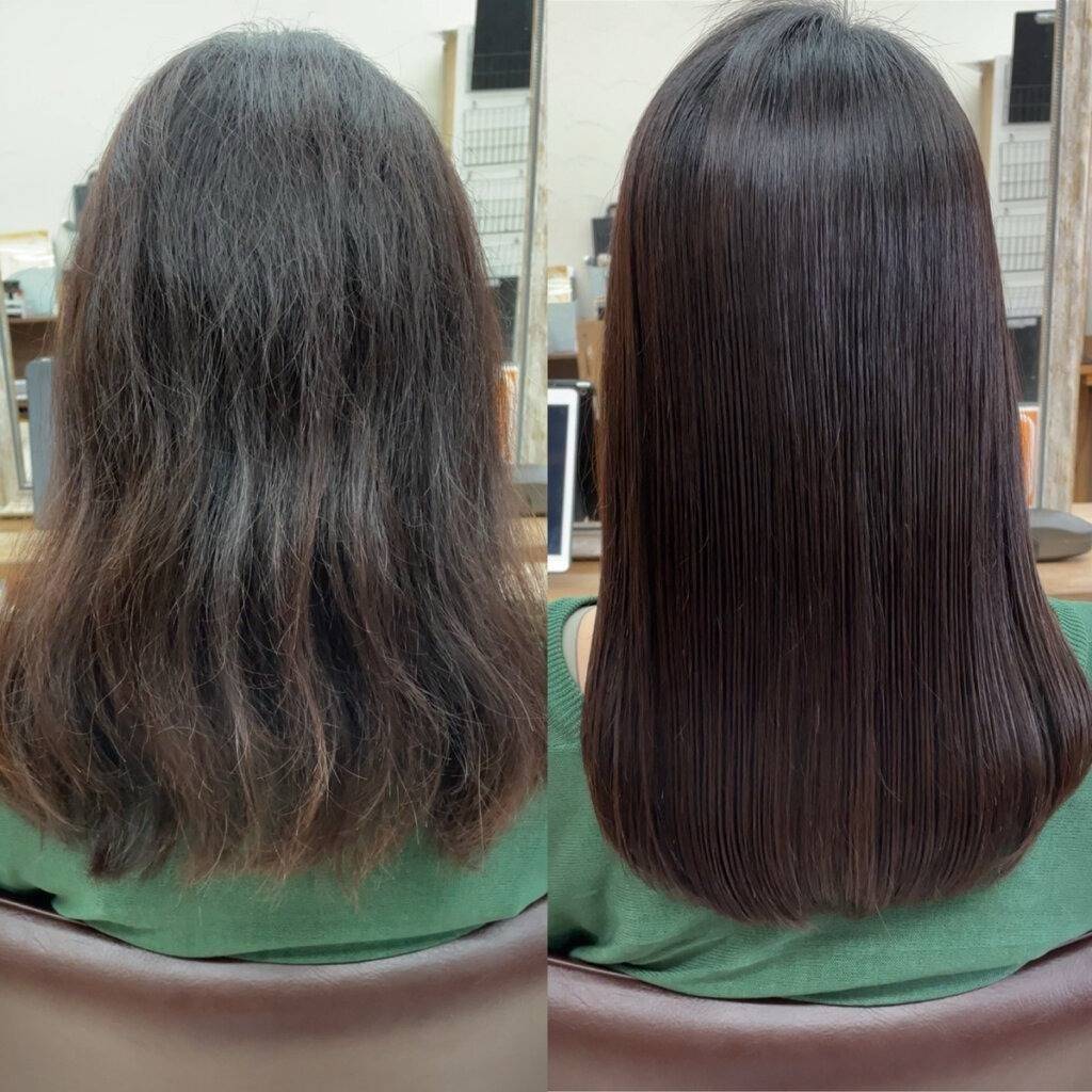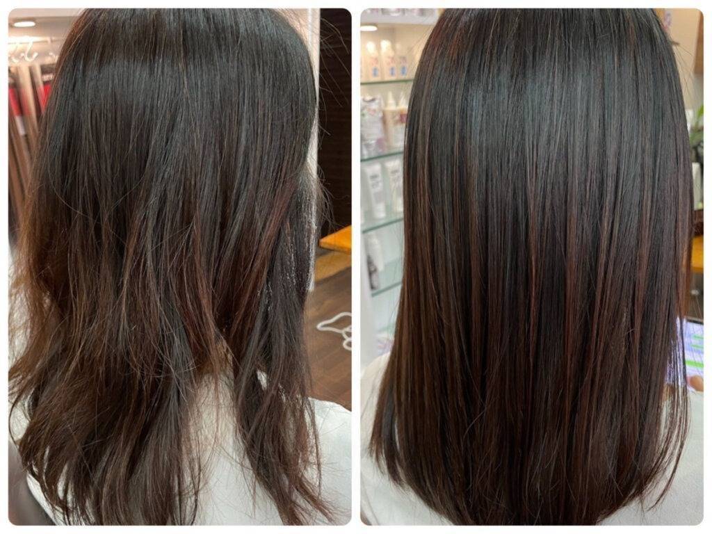 - 髪質改善縮毛矯正は、髪の癖をしっかりと伸ばし、艶を与える事ができます。