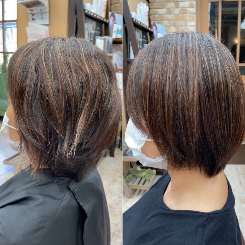 手でザッと乾かすだけでキレイにツヤツヤにまとまる髪質を手に入れた、お客様の髪の様子をご覧ください。