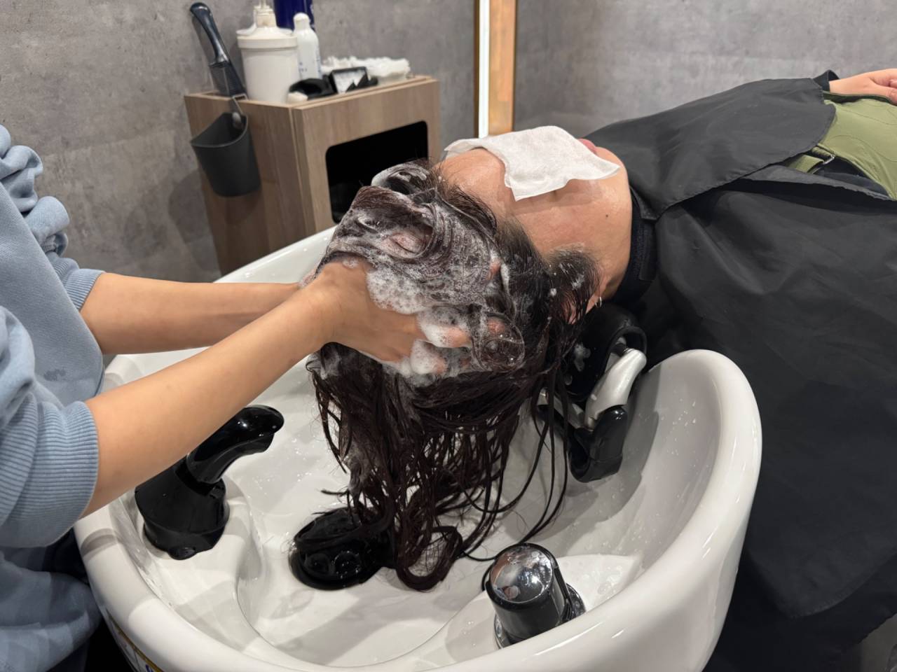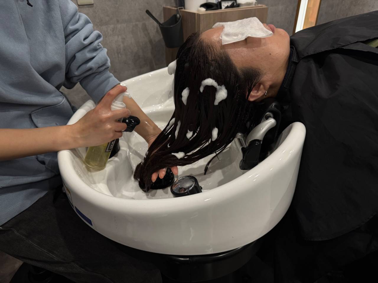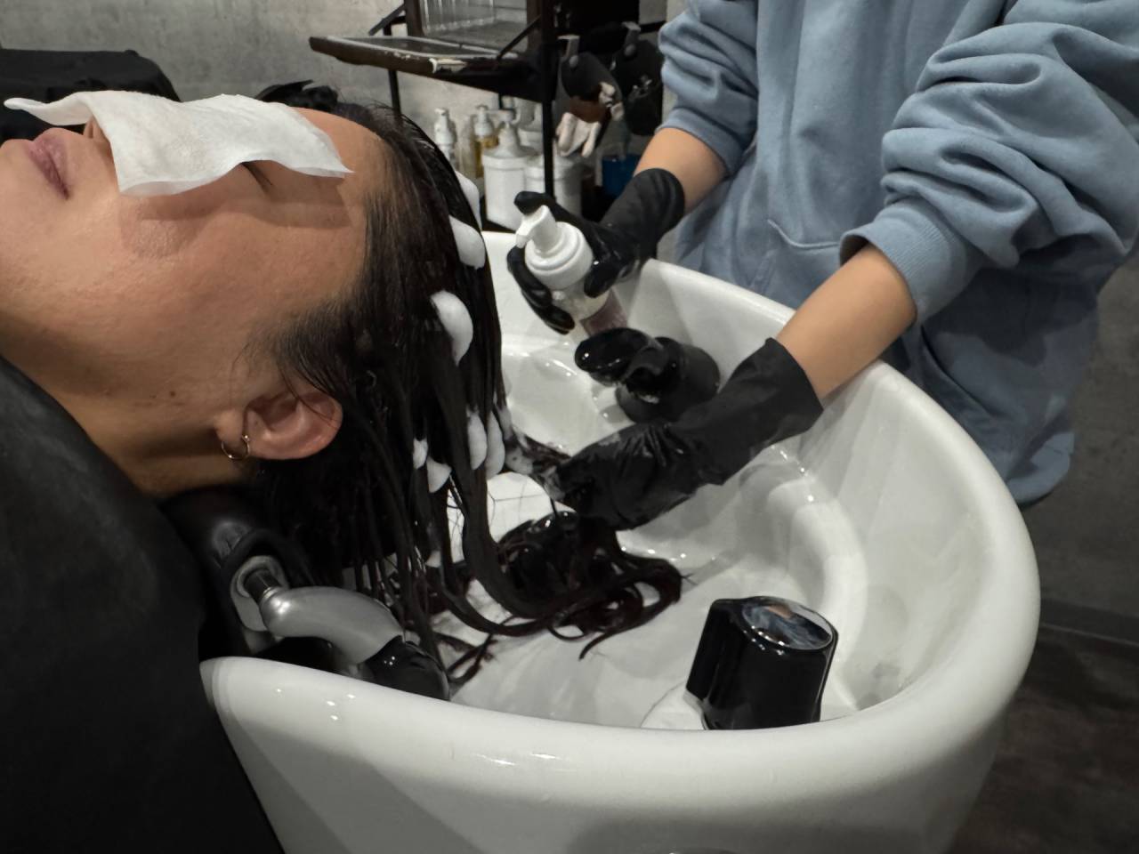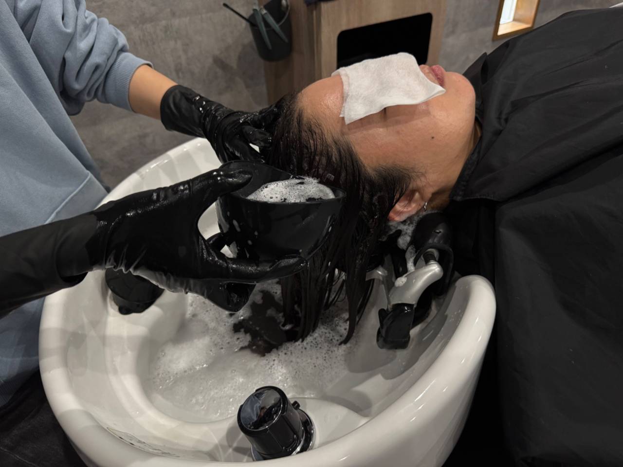 施術前のシャンプーでは、余分なシリコンを除去し、トリートメントの浸透率を上げるためにアルカリシャンプー剤を使用します。優しくもみほぐしながらシャンプーを行い、髪表面に付着したホコリや汚れを丁寧に取り除きます。