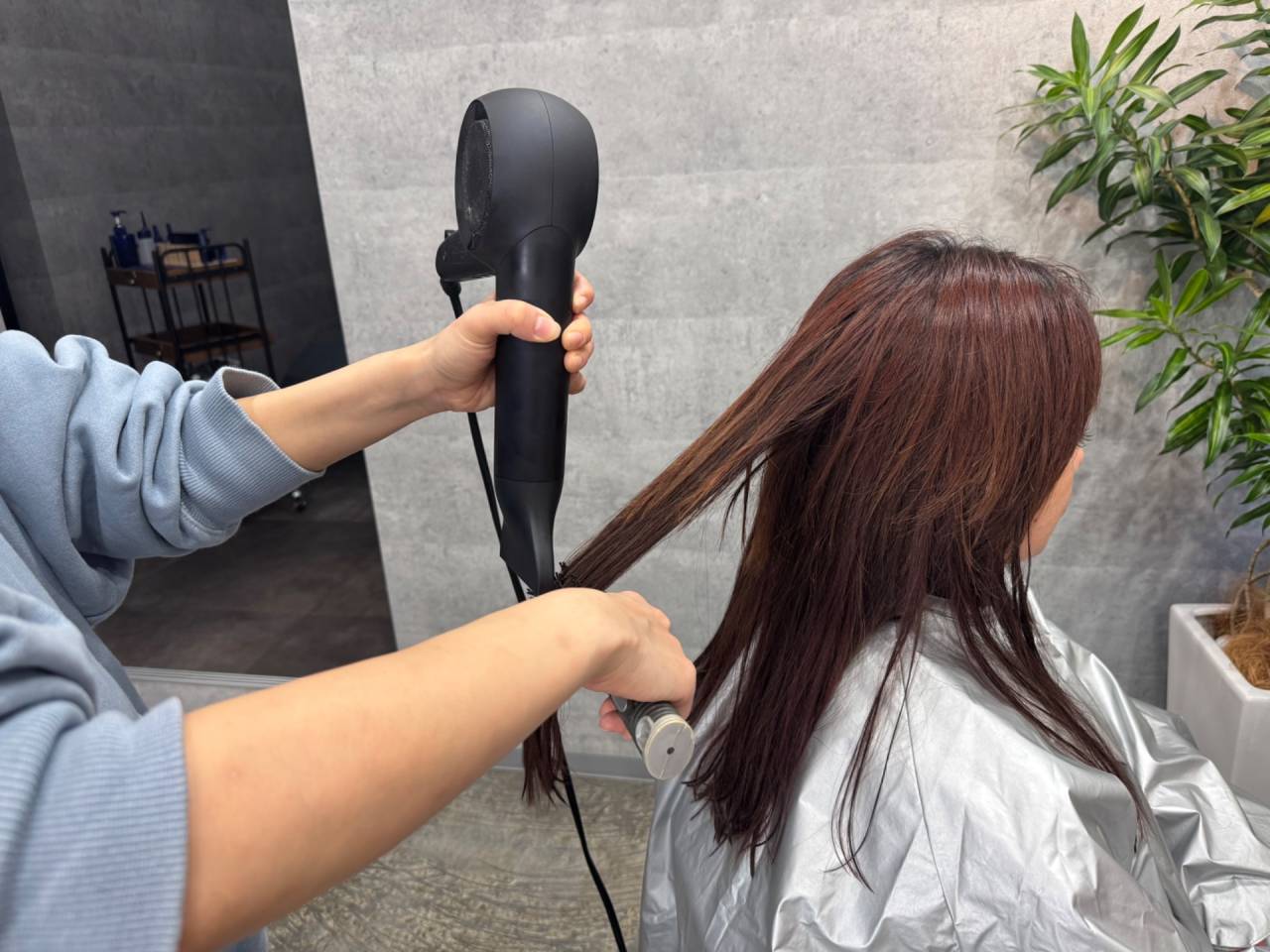 癖毛を自然に美しく整えるため、ドライやブローを丁寧に行い、根本の水分を適度に残しつつ毛先から乾かしていきます。特に、ハイダメージ毛にはブラシを用いて慎重にブローし、この水分量を残した乾かし方の工夫が特に求められます。