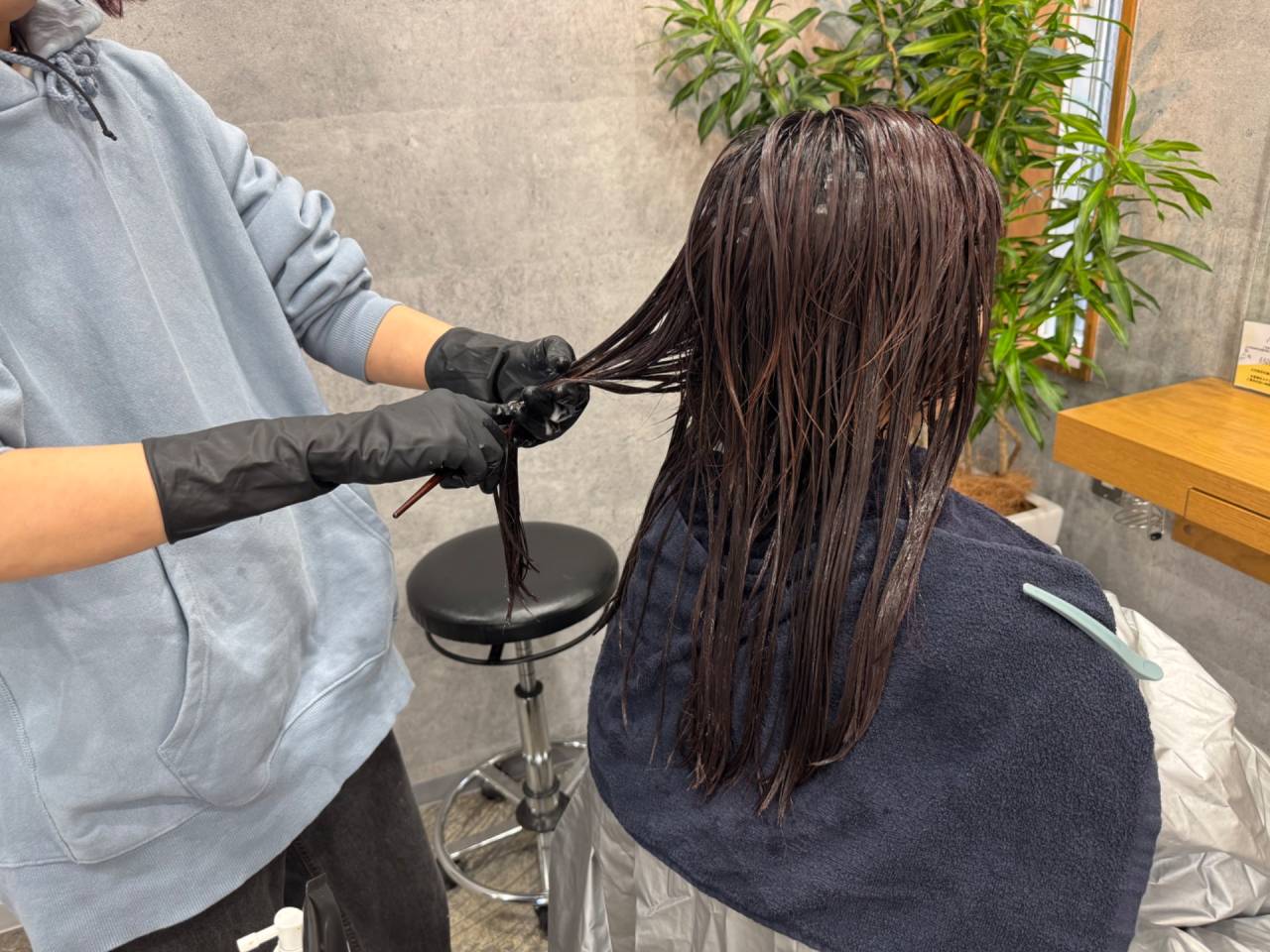 髪のダメージレベルを見極め、今回は酸性の薬剤を選択させていただきました。