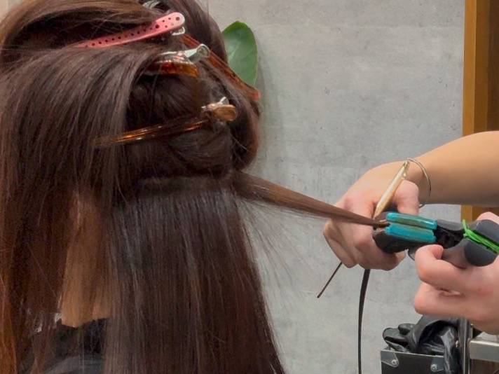 施術の質を高める為、ブロッキングし、丁寧にアイロンしていきます。無理のない体勢で、力み過ぎず、ゆっくりと丁寧にノーテンションで熱を与え、髪をまっすぐに整えます。この細やかな技術により、極めて自然な艶々の美髪が叶います。